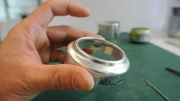 Algunas perforaciones con broca de 1/16 en el anillo superior de la estufa o un 1/32. El tamaño de los orificios dictará cómo es grande son las llamas. También puede empujar los agujeros con una gran aguja o chincheta.