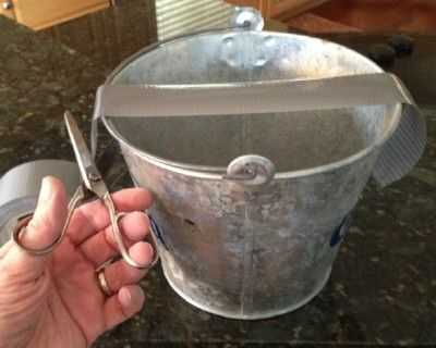 Estirar un trozo de cinta adhesiva en la parte superior del cubo. Deje suficiente voladizo a cada lado de la cinta adherir a los lados del cubo. Pat la cinta saliente contra los lados del cubo.