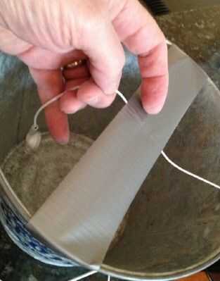 Prensa el micrófono en la oreja manzana cogollos contra el lado pegajoso de la cinta del conducto con la abertura redonda pequeña se muestra en la foto de la introducción señalando hacia el fondo de la cubeta. (Mi dedo índice señala a la ubicación del micrófono debajo de la cinta). El brote de oído en el cable con el micrófono que descanse contra la parte interior del cubo, o puede estar fuera de la cubeta.