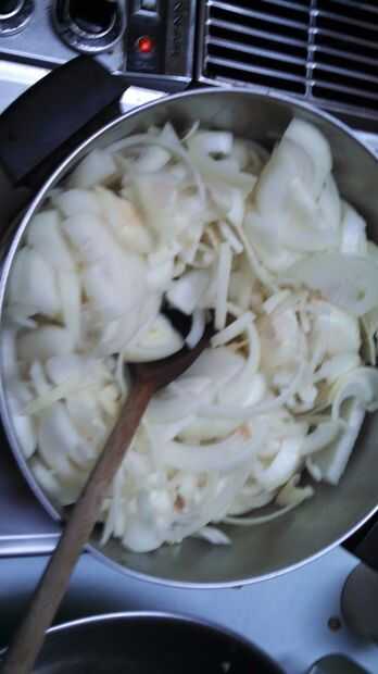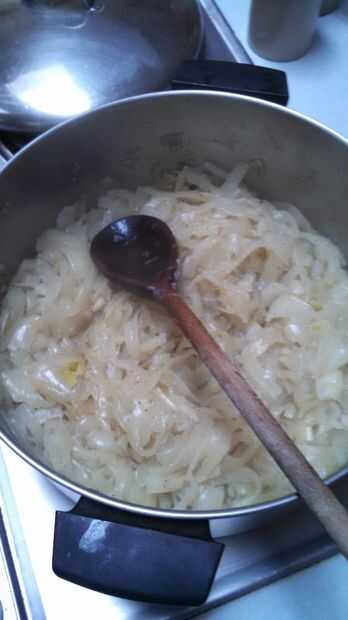 Después de que brown y quitar el ajo, poner las cebollas en y bajo el calor que tienen que cocinar abajo debe tomar unas horas, lo que quieres es que sean suaves y fáciles de comer, no necesita más aceite durante este tiempo, pero usted puede poner en un poco de pimienta para darle algún sabor. también ayuda a arrojar una tapa.