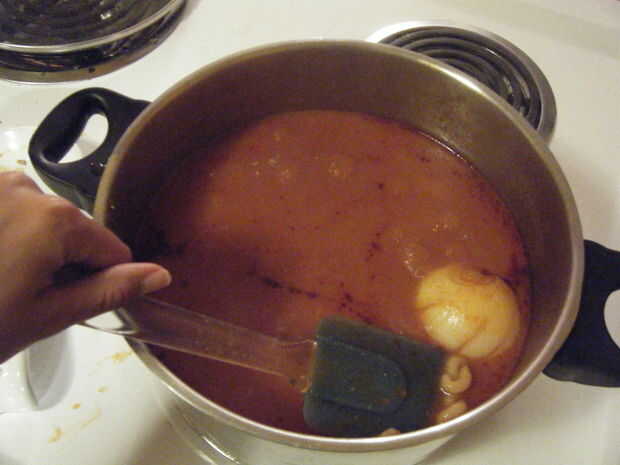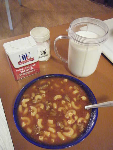 9. una vez que arranque el hervor añadir en 3 handfulls de macarrones. Generalmente taza mis manos juntos y sacar los fideos de mi jarra de macarrones y salir 3 cucharadas pequeñas. Si está usando una caja de 1 libra de macarrones pueden lanzar en sobre 2/3rds de la caja. No agregue demasiado o tendrás una sopa más. Si tienes manos grandes recomiendo tal vez primicias de 2 mano. Lo siento, que esta parte de la receta es tan vaga. Nunca he medido la cantidad de macarrones que he añadido.