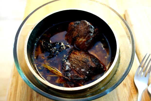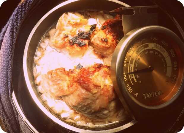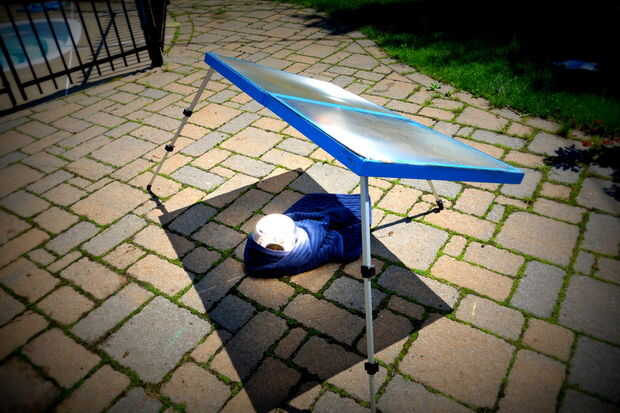 Coloque la olla para maximizar la eficiencia (perpendicular a los rayos del sol). Se puede saber cuán eficiente es mi olla por el tamaño y la oscuridad de la sombra debajo de la lente. Mueve probablemente el tazón de fuente cada 20 minutos y la lente una vez una hora para mantener todo funcionando con máxima eficiencia. El aire en mi cocina tiene sobre 200 grados Fahrenheit dentro de 20 minutos y llegó a 325 grados en su apogeo. Finalmente tomé la toalla lejos de la base para mantener la temperatura más cercana a 200 grados Fahrenheit. Dejé cocinar durante 4 horas, aunque la carne estaba cocida probablemente después de 1.5 horas. Entregó la carne sólo una vez para darle más salsa exposición y sol-cueza el otro lado.