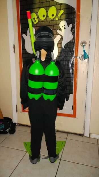 Para hacer los tanques de aire, hemos pintado dos 2-litros el color verde para que coincida con su equipo de buceo. Hemos pintado las tapas el negro para representar a un tanque de aire de buceo real. Utilizamos cinta adhesiva negra para mantenerlos juntos. Hemos prestado un par de tirantes negro de su hermana para garantizar en su espalda. Hemos invertido los tirantes. Nos recortan los 2 tornillos en la parte posterior sobre la cinta y cierre individual para el frente de su banda de la cintura. Trabajó muy bien. Cuando era oscuro afuera, ponemos un palo de resplandor verde de plástico y un palo de luz LED en cada tanque. Brillaba de una milla de distancia.