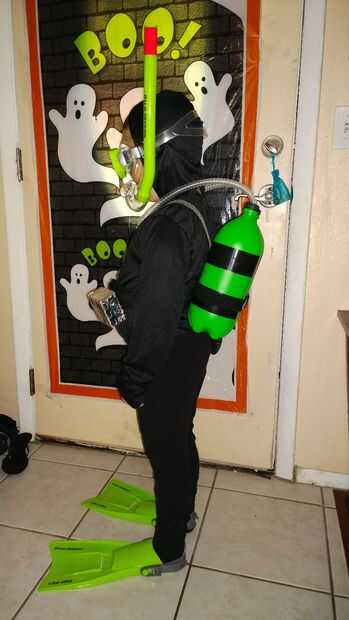 hacer un traje de buzo fácil!Lo que necesitarás:Mochila/correa/arnés {el animal que funcionaría muy bien, demasiado}Camisa de manga larga negroPantalones/leggings negroPintura en aerosol plataEspuma de artesaníaDos botellas de refresco de 2 litrosUna