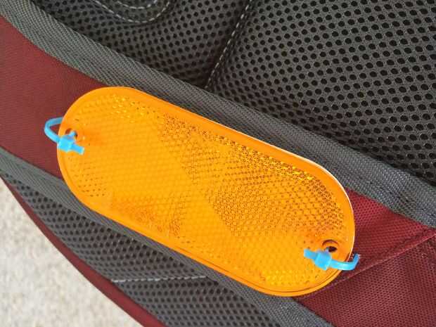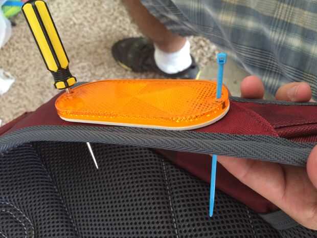Paso 2: meter cuidadosamente unos agujeros y ziptie los reflectores a su mochila. Algo puntiagudo ligeramente embotado puede mover a través de la tela sin romper hilos si tiene cuidado. Deja los lazos sueltos en su hombro porque tienen que ser capaces de tirar de la correa donde curva sobre su hombro.