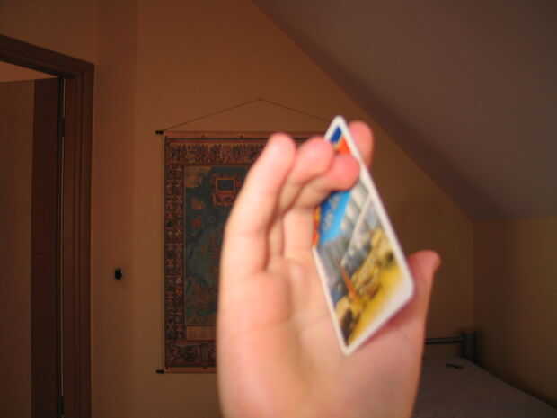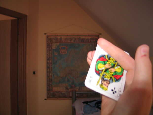 Esto es fácil. Tarjeta de derecho-para arriba esquina debe estar en el espacio entre medio y primer dedo. Esquina baja derecha como en la foto.