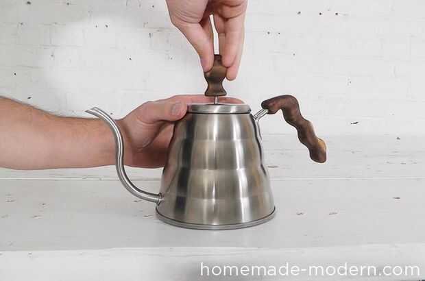 La original pomo de plástico para los tornillos de la caldera de Hario apagado. Me perforó un agujero en el nuevo pomo de madera y había atornillado sobre la tapa.