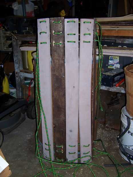 Así que después de que la mancha esté seca es simplemente una cuestión de tejer las piezas juntos. Los extremos de la cuerda serán atados junto en la costura por lo que la cuerda de la armadura que está en el lado exterior de los listones estrechos.