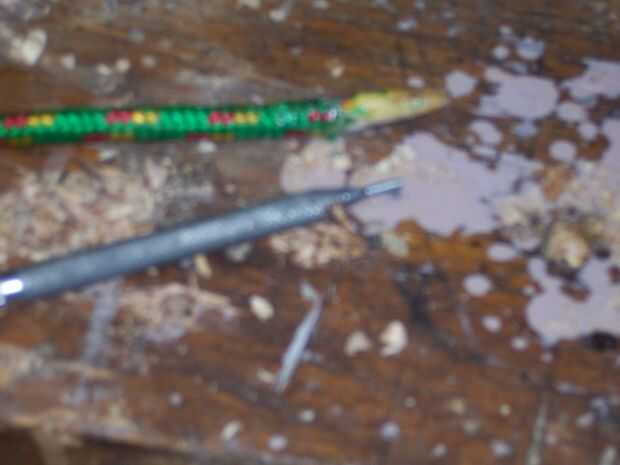 Para enhebrar la cuerda por los agujeros más fácil poner pegamento en los extremos de la cuerda y luego lijar para un poco de un punto.   Aún así el revestimiento exterior para algunas de las piezas de cuerda solía manojo hacia arriba y no pasar por los agujeros.  He encontrado que un pequeño golpe funcionó bien para empujar la cuerda por el agujero.