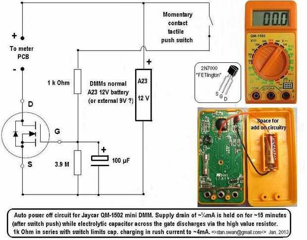 Un ensayo de placa con el 2N7000 verificado que un impulso momentáneo del interruptor táctil, con un 100 μF electrolítico, en paralelo con un 3.9 MOhm a través de la puerta, celebrada el medidor durante unos 10 minutos antes de que apareciera el símbolo de batería baja. Poco después el metro entonces apagado, en que etapa de la descarga de la batería se redujo de ¼ generalmente mA bien bajo 1μA. Este asimiento de ~ 10 minutos en el período debe ser suficiente para la mayoría de los usuarios, pero podría modificarse fácilmente con resistencias de descarga de valor diferente.