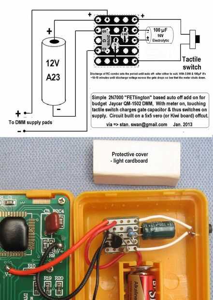 Construcción de prototipo que se muestra aquí fue hecha convenientemente en un pequeño sobrante de 5 orificios x 5 agujero Junta de Kiwi, con el cableado de alimentación ajustado como se muestra en el diagrama.  Evitar corto a los componentes existentes de metro con una pequeña cubierta de cartón sobre el trazado de circuito adicional.