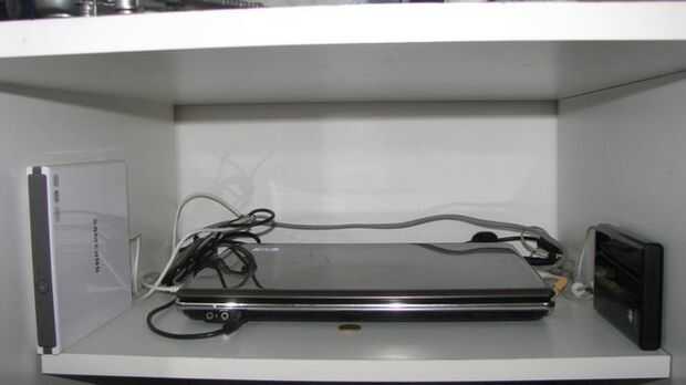Ya tenía un monitor y unidad de DVD externa por lo tanto sería práctico y rentable hacerlo. Observé que todo muy bien había colocado en el armario pero también señaló que la unidad de dvd no abre completamente, que es donde el disco externo entró en uso. Con cerrada la puerta del armario también noté calor acumulan así que quité el estante y corte dos agujeros para algún medio tamaño ventiladores. También usé cinta de doble cara para montar el DVD externo y disco duro fuera del camino.