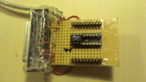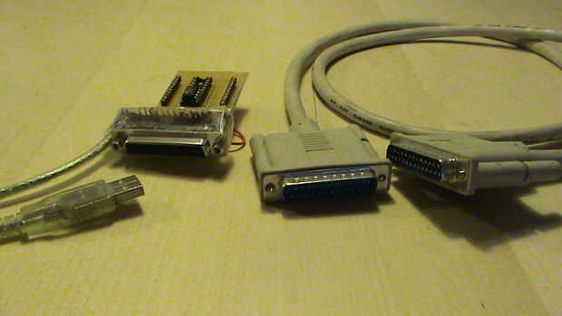 la tercera imagen muestra el paquete completo, la Junta de programación, el USB conectado es sólo para la alimentación de 5V (podrida de un viejo cable de impresora USB.) el cable a la derecha para conectarlo a la computadora (por supuesto) ya que por error pidió un puerto hembra de la impresora (sí, sé que su estúpido...)