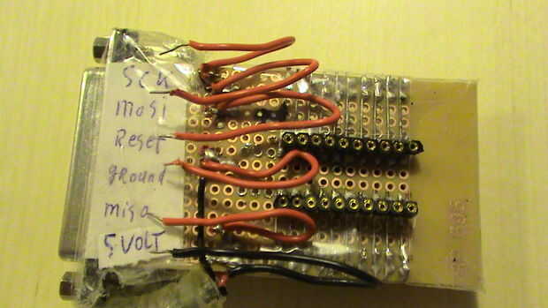 la primera imagen muestra el programador de la parte de abajo. Usé los solos alambres tubular para esto, como añade fuerza adicional para poner en los alambres. de esa manera puedo cambiar qué programación de im attiny. en esta imagen se establece en el attiny13 (con 8 pernos)
