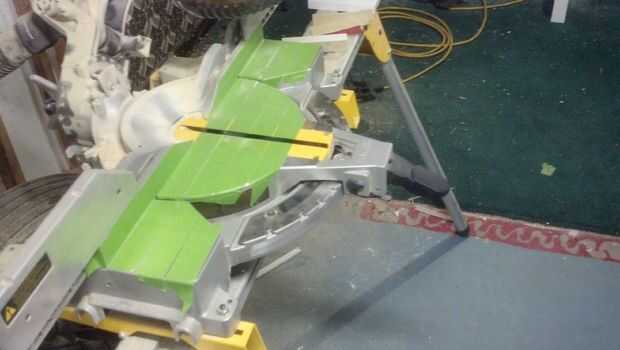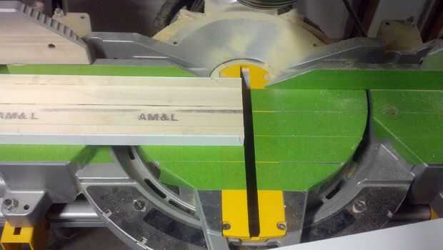 Corte en el interior y exterior ingletes en el adorno nos obligó a colocar la madera acabado de lado hacia abajo de vez en cuando. Desde el lado acabado se pintó de blanco, que seguimos recibiendo marcas sobre la superficie pintada de la cama de aluminio de la sierra. Como ustedes saben, aluminio es un metal sucio y marcará la mayoría de las cosas que frote contra él.