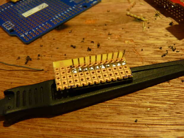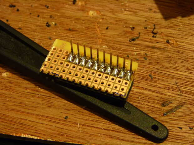 Si lo haces bien, esa primera soldadura de tachuela estará perfectamente alineada y el resto es fácil. Si no hacerlo bien, vuelva a tocar el hierro de la soldadura y luego vuelva a alinear el encabezado.