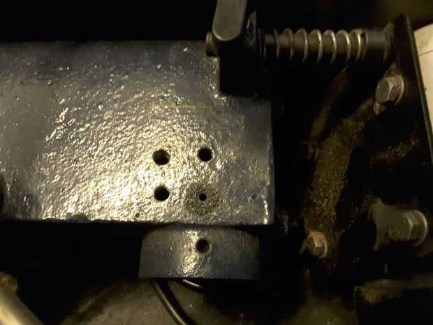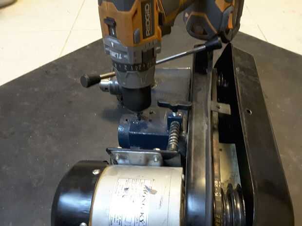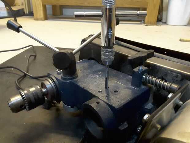 Había colocado el soporte en el lado de la cabeza de taladro, centro perforado los agujeros y perforar con una broca de 5,5 mm. Para los tornillos de M6x1mm, el tamaño del grifo tablas recomienda utilizar un una broca de 5,4 mm para esos tornillos, pero no tengo ese tamaño de taladro de mano. Usé un M6 x1 Pulse m para los cuatro agujeros del hilo de rosca.