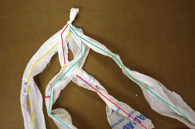 Tomar cuatro de los seis hilos y atarlos juntos en un nudo. No tire el nudo muy apretado todavía porque puede que desee aumentar la longitud de la silla más adelante, en cuyo caso usted necesitará sacar el nudo. Uno de los filamentos será más corto que los otros, pero no te preocupes.