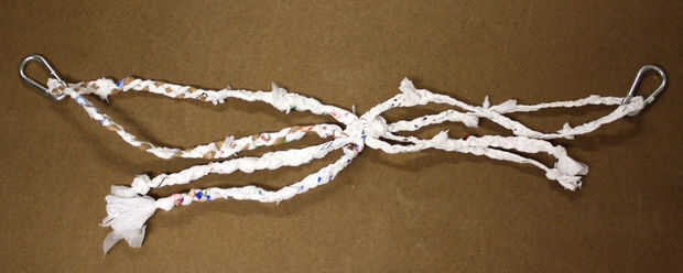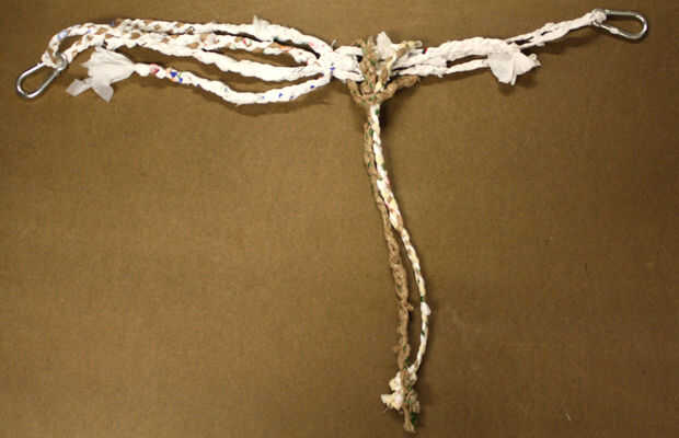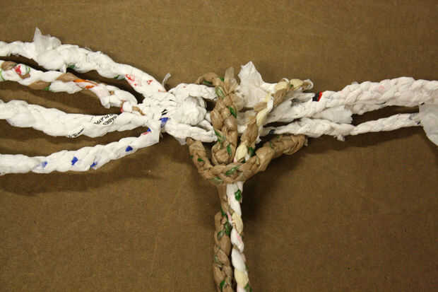 A partir de al lado de los nudos de la Plaza, doblar una cuerda de 7 yardas a la mitad y atar el nudo de alondra (consultar este vídeo para saber cómo) para sujetar al respaldo, dejando los extremos cuelgan. Continúan Fije las cuerdas a lo largo del respaldo hasta que se han unido la mitad de ellos y luego el resto al otro lado del respaldo.