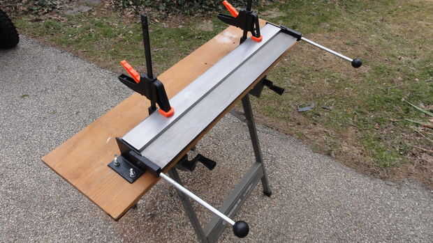 Están montadas en el freno a una tabla que tiene un pedazo de madera por debajo del cual se puede fijar en un banco de trabajo portátil. El tablón tiene un agujero por lo que sólo puedo colgar en la pared cuando no esté en uso. Los brazos Desenroscar y son removibles para ayudar a hacer para el almacenaje compacto.