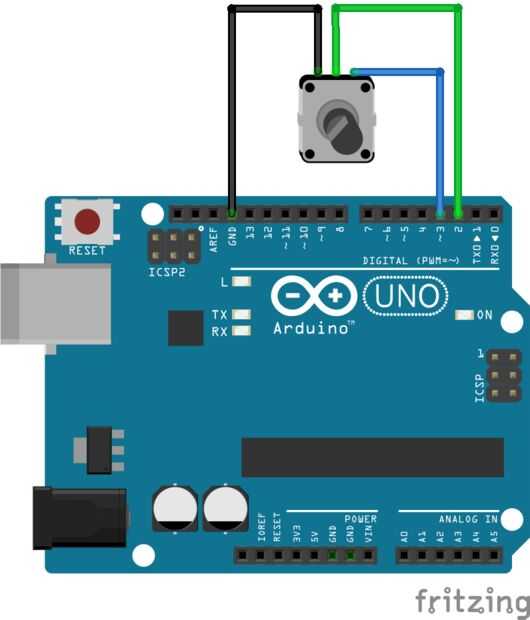 Fuera de los tres pernos juntos, el conector de tierra de codificador se conecta al conector de tierra de Arduino. Cualquiera de los otros dos pines está conectado al pin digital 2 y el restante en está conectado al pin digital 3. Si su dirección de rotación no es la forma que desea, solo cambiar los dos pernos de tierra no sobre.