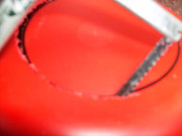 -Quite la tapa de la caja y perfore un agujero en el centro del círculo que sólo dibujada.