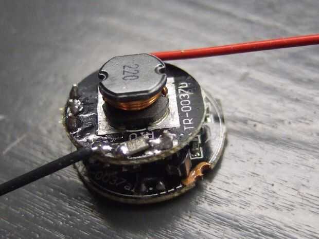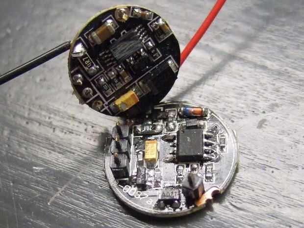 Los tres modos del controlador se especifican como 800mA en alta, 200mA en bajo y estroboscópico de 400mA. Puesto que las "Especificaciones" de dichos productos de DX no son muy ajustadas y parecen estar en contradicción directa con las fórmulas útiles proporcionadas por los fabricantes de IC, iba adelante y había medido las corrientes yo. Las corrientes medidas son 1200mA alta, 250mA en bajo y estroboscópico a ciclos de trabajo altos. Su revisión de kilometraje y el circuito puede variar. Las corrientes se establecen por medio de resistencias que son difíciles de alcanzar y por lo tanto nuestra tarea es cortan los PCB circular dos y cambiar las resistencias y luego soldar entre sí las dos juntas hacia atrás. El más pequeño PCB superior es el tablero de conductor, y el inferior más grande es el microcontrolador que establece que resistencia está siendo utilizado por algunos transistores.