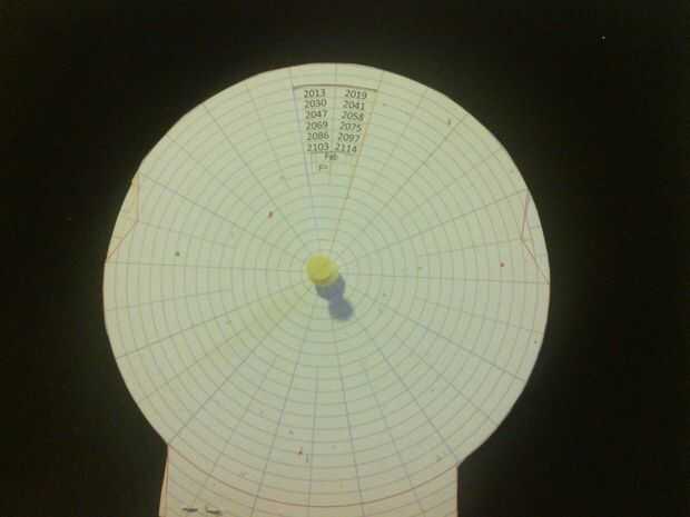 Puede utilizar este calendario perpetuo hasta el año 2050. Sólo usar: 2 papeles A4 (solo tienen 2 capas)Paso 1: Dividir el círculo en 42 seccionesDividir el círculo en 42 secciones de tu equipo, con el tamaño en 1 papel A4:Círculo 1-5: R = 9, R = 8,