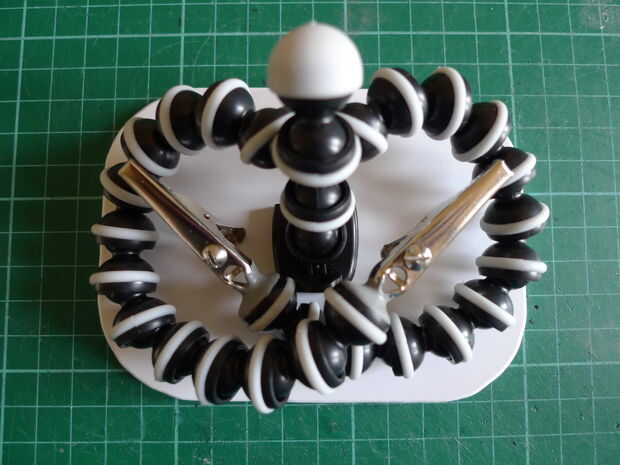 Usted va a necesitar un taladro, de epoxy, pinzas de cocodrilo, trípode Gorillapod flexible copy cat y por la base, una pieza de plástico por lo menos 6mm de espesor (de lo contrario no cabe el tornillo del trípode) o un bloque de madera de la madera.