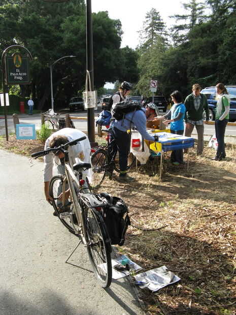 En la tabla ofrecemos coffeecake, café, naranjas, plátanos, bolsos de la lona, cupones, mapas de bici, entrada rifa de bicicleta, agradable conversación y cada jinete nuestra pregunta para este año: "¿Qué te gusta más y menos sobre desplazamientos de bicicletas"?