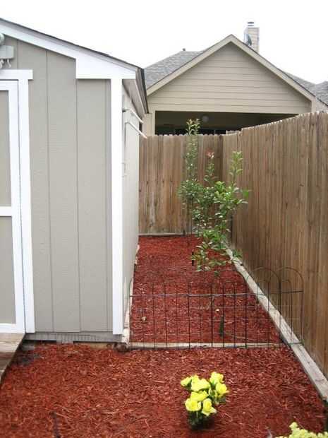 En mi caso, hice una cama de paisajismo que se extiende alrededor de tres lados del edificio (lado 4 tiene la cubierta). La cama está rodeada de paisajes maderas en la base de la valla y bordes de metal pesado donde se une con el resto de la yarda.