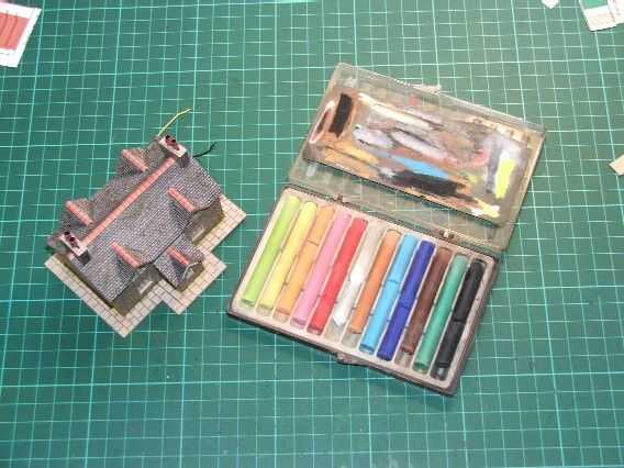 Finalmente algunos pasteles se utilizan para atenuar cualquier residuo de pegamento brillante y desarrollar algunas vetas de lluvia en el techo y las paredes. Ejecutando algunos medio tono pasteles alrededor de la parte inferior de las paredes y la base ayudará a establecer que el modelo en es la base en lugar de como si simplemente ha sido caer hacia abajo. La técnica básica (Figs. 19 y 20), es usar un conjunto barato de arte pasteles de tierra hacia abajo con el papel bien mojado y seco. Punta el pequeño montón de polvo en algún papel o tarjeta y luego recogerlo con un cepillo suave. Simplemente cepille al modelo para una sutil coloración, luego Suénese suavemente el exceso. Los pasteles pueden ser mezclados para crear casi cualquier color y esto puede hacerse en húmedo y seco o como una paleta de papel limpia. Una vez que estés satisfecho con el efecto, rocíe el modelo con fijador de artista, o laca de cabello barato hacer el pastel. No ser tentados en esta etapa a sobre pintura con barniz mate a menos que se puede rociar, cepillos alterará los pasteles.