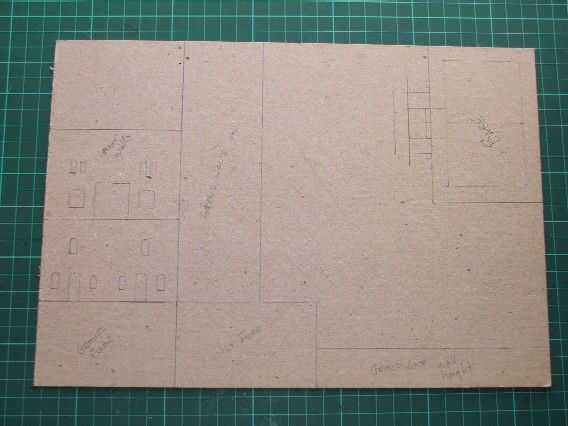 Una vez que el marco ha sido disecado (Fig 4), sus dimensiones son transferidas sobre a la plataforma de capa. En la Fig 5 usted puede hacer hacia fuera las marcas de la dimensión en la almohadilla de la base, planta baja, primer piso y las paredes frontales y posteriores. Las paredes laterales son una tira genérica en esta etapa. Puesto que el cojín de la capa es de 1mm de espesor subsidio debe ser hecha para el agregado grueso, por lo que las secciones de pared de extremo se reducen del patrón Metcalf en 2mm en toda su anchura.