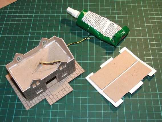 Yo entonces cementado el suelo en posición, corte la sección de la azotea y agregó dos fortalecimiento apoya al techo (Fig 13). Los soportes fueron cortados para que encajaría perfectamente dentro de las paredes laterales. Las secciones de dormer tuvieron que ser relevado por 2mm para el espesor de pared adicional. Prueba de funcionamiento seco montaje se asegurará de que encajan correctamente antes de la instalación.