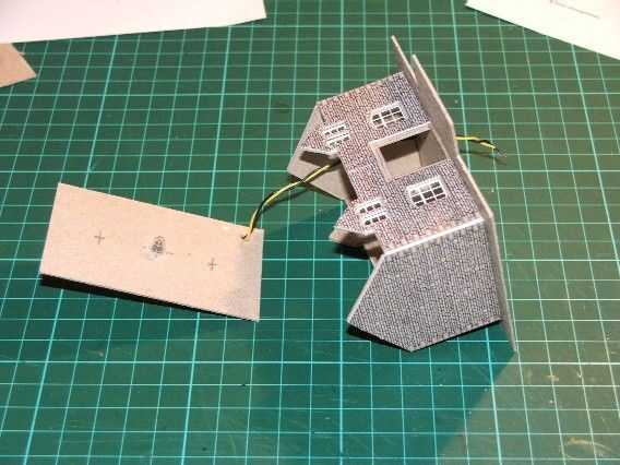En esta etapa usted puede agregar algunos iluminación interna. Prefiero utilizar LED en amarillo anaranjado o blanco, pero encontré que tenía sólo rojo y verde a la izquierda. Pensaba utilizar dos 3 mm super LEDs pegado en el techo pero solo tuve un grano de trigo bombilla izquierda en mi caja, tenía que ser una lámpara en la planta baja sólo. Taladré un agujero de 5mm en el centro de la planta y dos agujeros más pequeños cerca de una esquina de la primera y la planta para pasar el cableado. El bulbo fue cementado en usando el pegamento GP ya que estaba seguro en cuanto al uso de pegamento en la base de la bombilla. Fig 12 muestra el primer piso listo para entrar junto con la bombilla y el cableado. También se observan las marcas originales para el LED.