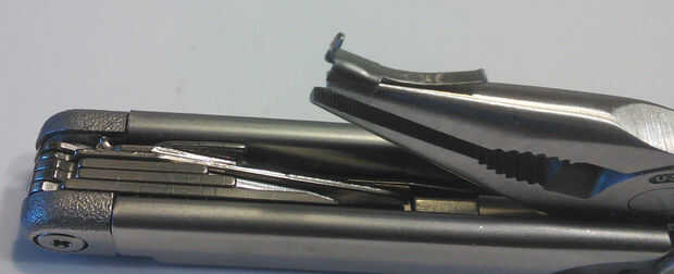Por lo tanto, mirando a su alrededor, vio las quijadas de los alicates en mi Leatherman. Cogió otro par de punta de aguja, había equilibrado la diapositiva del metal en las puntas de la Leatherman y aplica una presión muy suave. La forma de los alicates dio justo la presión justa para separar las alas de la diapositiva, y terminé con un ajuste perfecto.