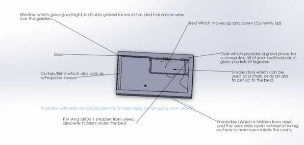 La cama es otro de mis 'grandes Ideas'. Se mueve hacia arriba y hacia abajo, dependiendo de si desea más espacio o no. Cuando toca, permite total de la habitación por debajo de la zona de la cama, que le permite trabajar en su escritorio y jugar en su computadora. Sin embargo, cuando quiere ir a la cama, simplemente girar una llave y tire de la cama hasta justo por encima de la altura del equipo. La cama también incorpora un proyector que puede activar cuando la cama está abajo, y proyectará en el extremo lejano de la pared - la persiana que cubre la ventana.