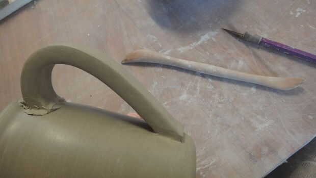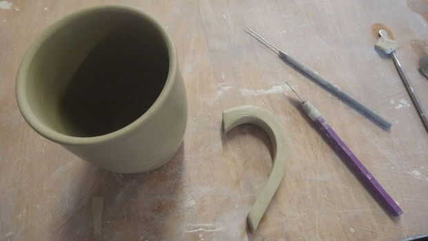 • Utilizar una herramienta de madera para 'pulir' el asa y el vaso juntos. Trato de dejar un pequeño 'radio' entre la Unión, que distribuye mejor la carga y evita el agrietamiento.