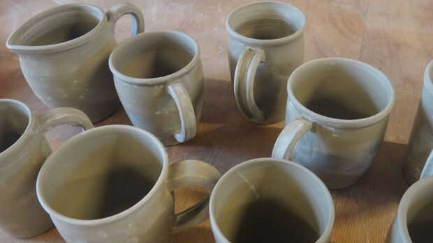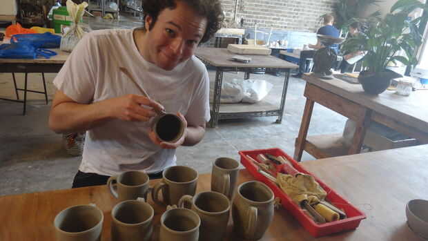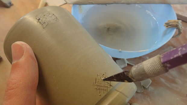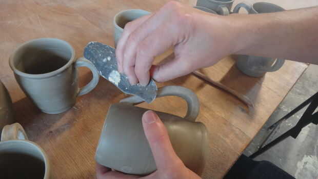 • Colecciono la arcilla 'segunda vuelta' de lanzar potes en un tarro de mermelada, que actúa como un perfecto 'cola' para pegar el mango con. (Los recortes de agua también funcionan bien si olvidó esto).