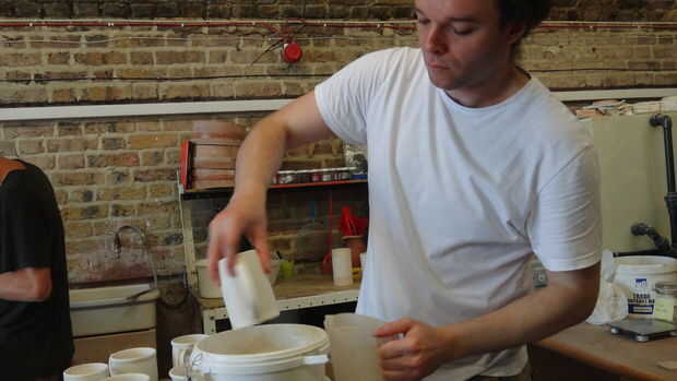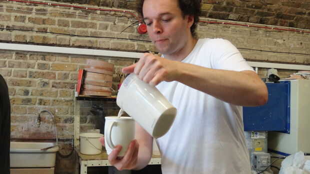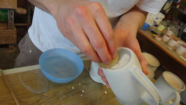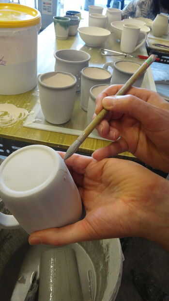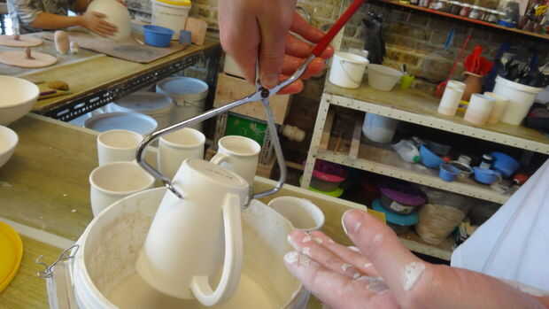 Una vez que tengas tus piezas alimentadas con sopa de nuevo, estás listo para les esmalte. Preste atención a la limpieza como mucho el esmalte de la ranura como se puede - usted no quiere que sale media cocción y pegando su recipiente en el estante de horno! Cualquier defecto de esmalte (marcas de pinzas, etc.) con un pincel de retoque.