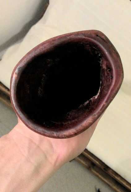 En este caso particular la bellend tenía un montón de material en exceso. Usé un largo cincel y un martillo de madera para retirar el material. Este es el paso más complicado y peligroso. Tenga cuidado de no quitar demasiada madera o eres instrumento tendrá una pared muy delgada o incluso un crack. Así el trabajo en pequeños pasos, retirar pequeños pedazos de woold posteriormente. En la primera foto ves la bellend antes de ser trabajado y en la segunda foto ver el mismo bellend después de todo funciona en el didge están acabados.