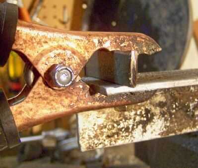 En la foto se puede ver moler a los picos restantes en el mejor lado de la abrazadera (la mitad inferior en la foto). También presentar la cabeza del tornillo por lo que no se levanta sobre el aluminio en la quijada a todos. Y he insertado un pedazo de chatarra de acero entre la mandíbula y la pieza a la que se une la abrazadera. Esto hace un punto de presión en el centro de la longitud de la quijada de la abrazadera que tira el aluminio plano añadido a la mandíbula firmemente contra la pieza de trabajo para una amplia área de contacto eléctrico. Si uno se soldadura en un tubo redondo, realizará la misma función sin una pieza añadida de chatarra.