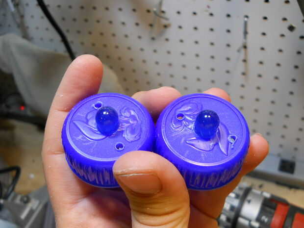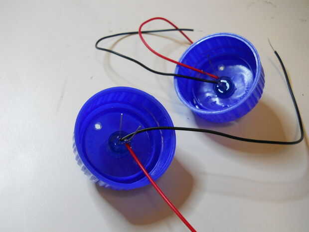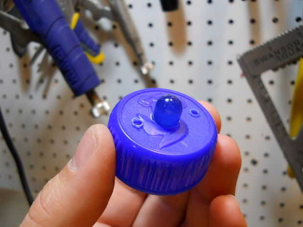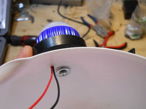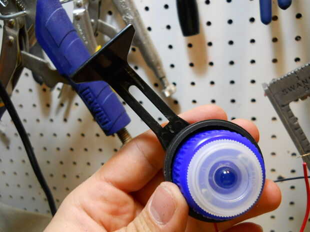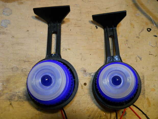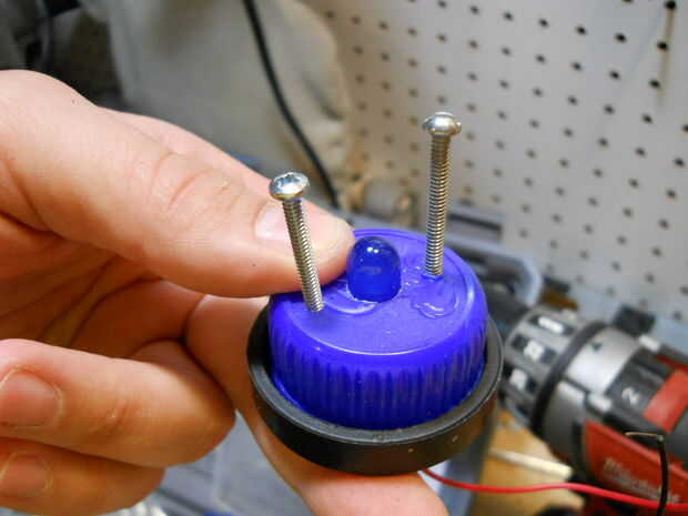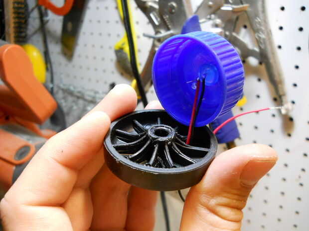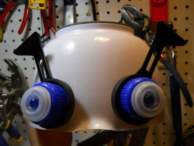 Construir los ojos usando las ruedas, las tapas de plástico y los topes de dinero, dejando los LEDs en el centro de cada uno. Fije los ojos en el recipiente de plástico.