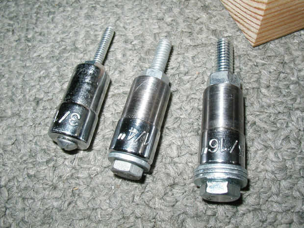 1/4" casquillo: 1 cada 1/4-20 X 2-1/4" perno 1 cada 1/4-20 tuerca (perno carga puede conseguirse para evitar que el buje de spinning suficiente) 3/16" Arandela NOTA: esto era necesario porque la longitud de la rosca del perno fue poco a poco. Además, prefiero usar la lavadora más pequeña siguiente si es posible. No estoy de acuerdo con el estándar del sector para las arandelas. Ayuda a reduce la deformación de la lavadora, especialmente con aplicaciones de madera. Nota: también se usar un dos tamaños de lavadora más grande con la lavadora más pequeños en aplicaciones de madera, soldar los dos juntos. Esto ayuda en la distribución de la carga a la madera sobre un área mayor, reduciendo así el estrés de madera debajo de la lavadora. Si uno observa construcción de madera atornillada correctamente esto es tomado más (mucho más grande y más grueso de lavado).