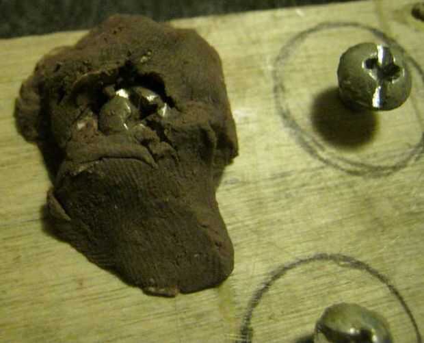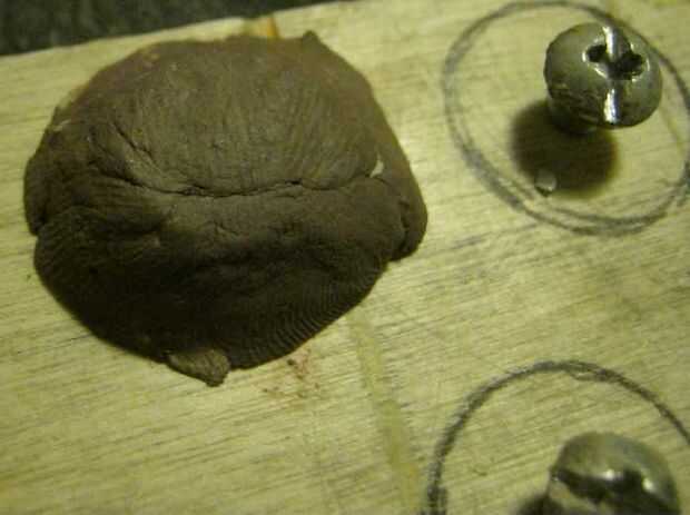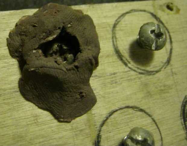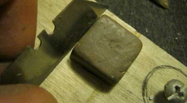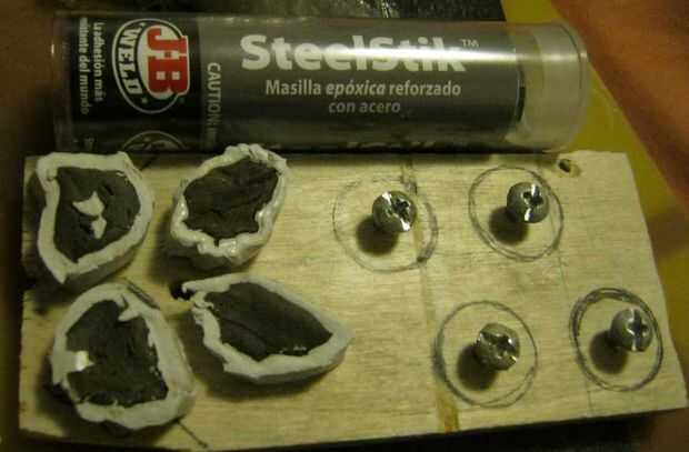 Una vez que el epoxi se mezcla, tomar dos mitades y empujar por debajo de la cabeza del tornillo. A continuación, atornille la cabeza en más profundo y cubierta la cabeza con epoxi. Usando una cuchilla de afeitar, formando un cuadrado y utilizar los arcos de círculo que se dibuja como guías para la Plaza. Permitir una cantidad adecuada de tiempo para que el epoxi curar.