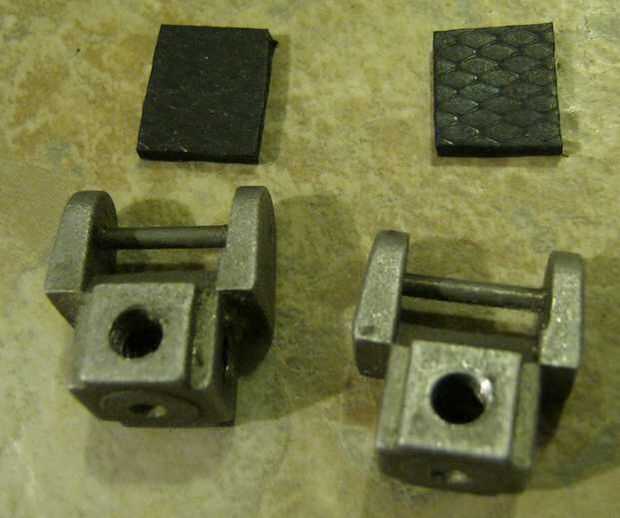 En este paso, cortar unos cuadrados de goma. Esto evitará que el adaptador de caerse de la Sierra de calar sin ninguna tensión en la hoja. Utilice una perilla y tornillo hexagonal para cada adaptador. En conjunto, esto permitirá una más fácil extracción de la cuchilla y debe hacer aserrado en madera o plástico mucho más fácil.