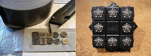 Deshacerse del agujero de botón la parte trasera el botón con el cuchillo; hacer que cada botón plano. Pegar la parte de atrás del botón y pegarlo a la pequeña plaza uno por uno.