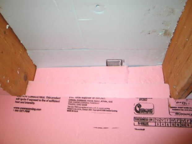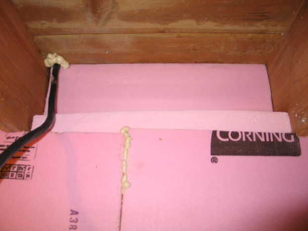 Si utilizas aislamiento rígido, a lo largo de dos de las paredes tendrás que los tableros de la espuma hasta las vigas del piso a tope. Usted tendrá que llenar entre las vigas con rollos de fibra de vidrio o con piezas de fricción de aislamiento rígido en las aberturas. Asegúrese de sellar cualquier aberturas o brechas en el bloqueo.