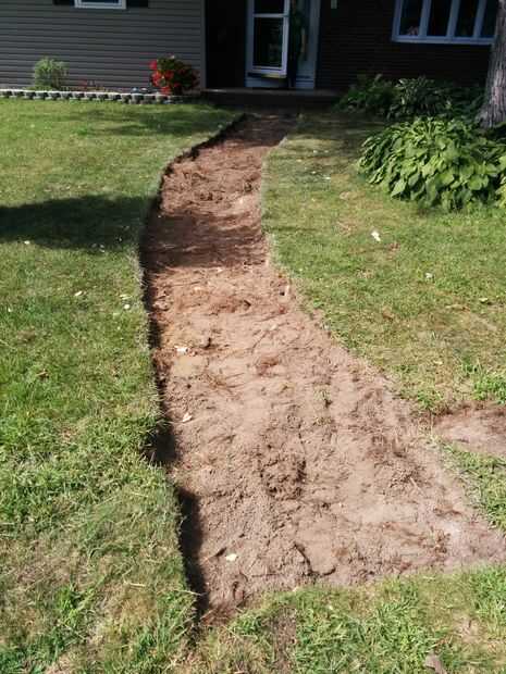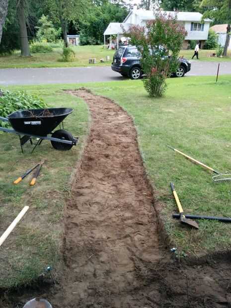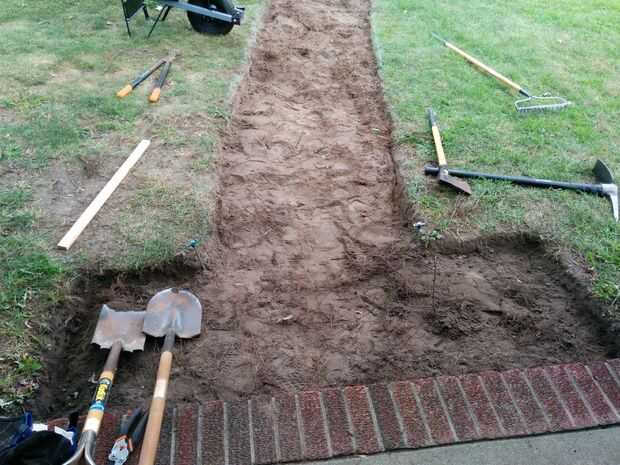 Trabajar su camino por el sendero hasta que se quite la hierba. No te preocupes acerca de cómo llegar a la profundidad del acabado ahora, basta con retirar la capa superior de hierba, raíces y algunos suelos.