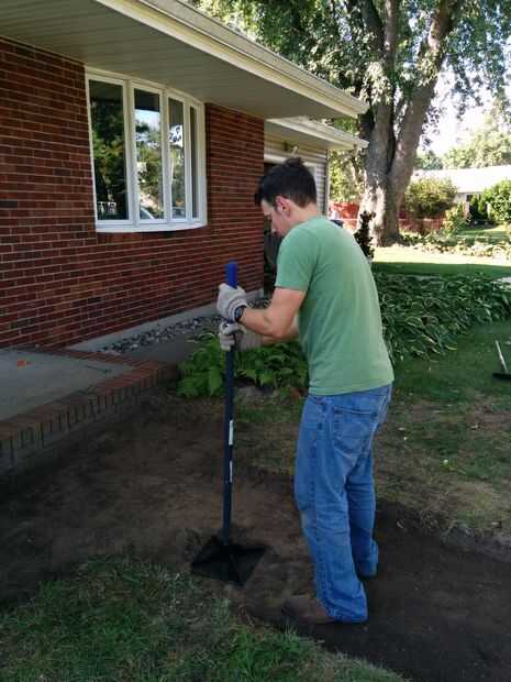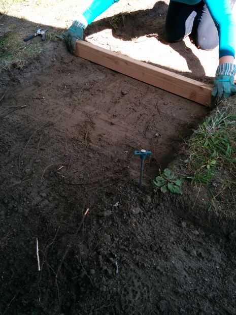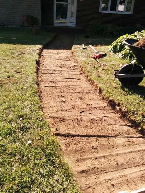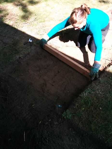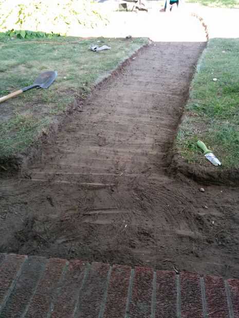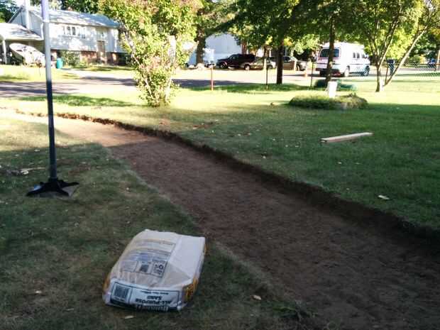 Una vez has cavado hasta la profundidad final (se estima aproximadamente 4" pero encontró que 3,5" mucho) tomar el corte de 2 x 4 al ancho final y empezar a arrastrar en el camino. Esto sirve dos propósitos: a nivel de su superficie/exponer los puntos que usted puede necesitar rellenar, y que le ayuda a comprobar que la profundidad de tu camino está aún en todas partes. Puesto que sólo cavamos nuestro camino a una profundidad de 3.5", todos tuvimos que hacer fue para asegurarse de que la parte superior de la 2 x 4 fue casi incluso con el nivel del suelo circundante. Como va a trabajar su camino por el camino, notarás puntos bajos por debajo de 2 x 4. Toma parte de la suciedad excavada, llene el punto por debajo del borde inferior de la 2 x 4 y alíselo nuevamente, esta vez eliminando el exceso de suciedad.